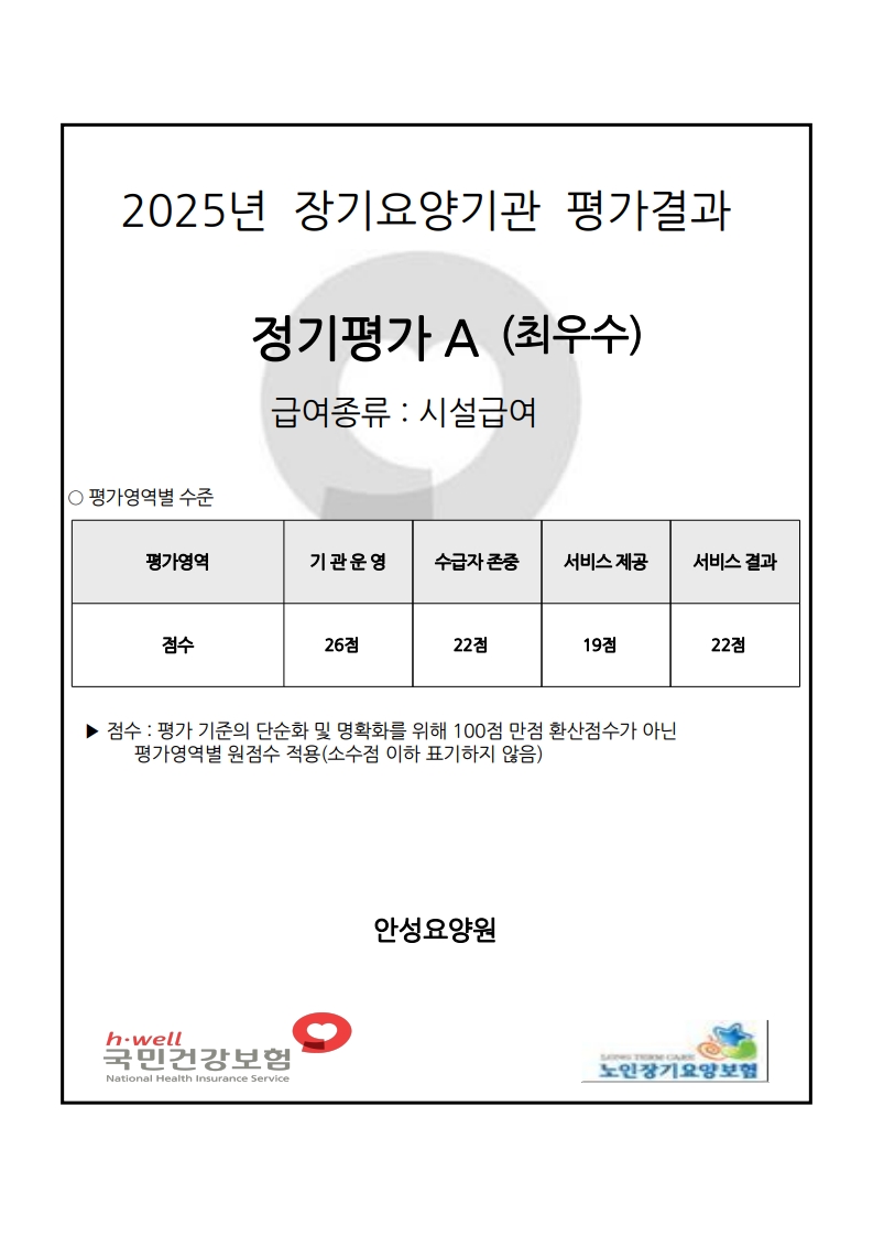 안녕하세요. 저희 안성요양원을 항상 믿고 이용해주시는 보호자님과 어르신들께 진심으로 감사드립니다. 안성요양원은 이번 2025년 장기요양기관 평가에서 A등급(최우수)을 받았습니다. 이번 평가는 기관 운영 전반에 걸쳐 서비스의 질, 안전관리, 종사자의 전문성, 어르신 돌봄 수준 등을 종합적으로 평가하여 이루어진 결과입니다. 이는 어르신들을 위한 정성 어린 돌봄과 보호자님의 신뢰, 그리고 직원들의 꾸준한 노력이 함께 만들어낸 의미 있는 성과입니다. 앞으로도 안성요양원은 A등급(최우수) 기관으로서 더욱 안전하고 따뜻한 돌봄 서비스를 제공할 수 있도록 최선을 다하겠습니다. 감사합니다. ![]() |